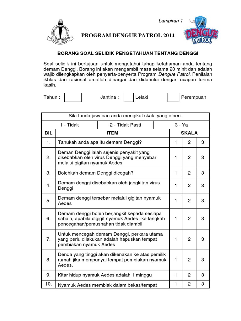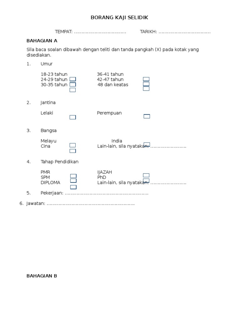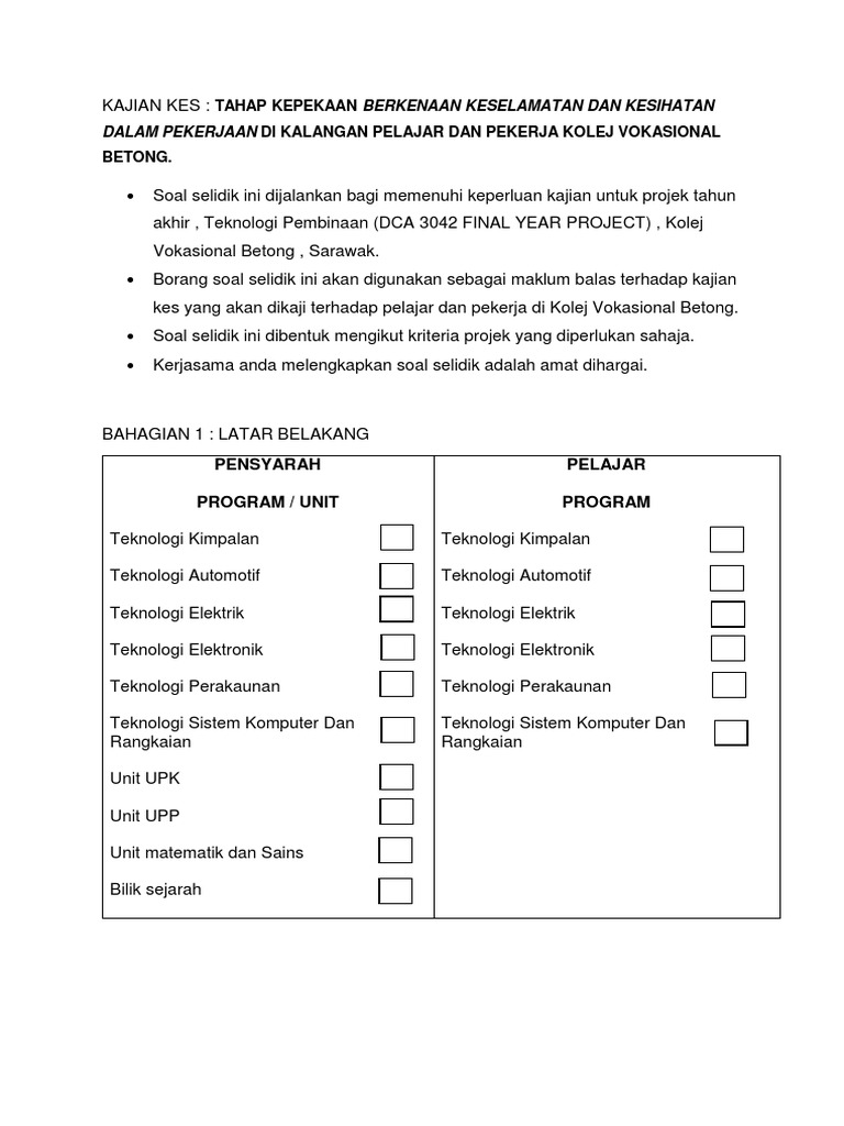 Borang kaji atau soal selidik ini perlu dibuat dan disertakan dalam perlaksanaan kajian kes bagi ujian pelbagai instrumen (geografi) pentaksiran tingkatan 3 (pt3). Bagi melengkapkan kajian ini, instrumen yang digunakan ialah borang soal selidik. Contoh borang soal selidik kerja kursus bahasa melayu (stpm)full description. Tentu karena faktor keselamatan tidak hanya bisa diupayakan melalui usaha zahir atau usaha nyata saja, tetapi juga harus dilakukan ikhtiar spiritual. Soal selidik ini adalah bagi memenuhi keperluan penilaian berasaskan sekolah (pbs) untuk mata pelajaran pengajian am 900/4.